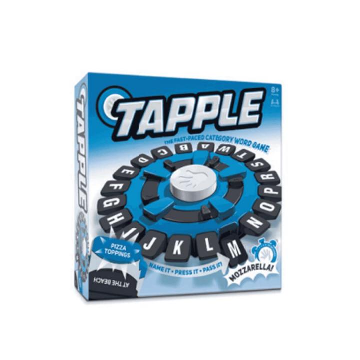 Tapple Tapple es un emocionante juego de palabras que ofrece a familias y amigos una experiencia llena de emoción y diversión.Los jugadores compiten entre sí para vencer al cronómetro mientras encuentran palabras que encajen en una categoría específica.El juego es fácil de jugar y no requiere habilidades especiales. Los jugadores simplemente eligen una categoría, dicen una palabra que encaje, tocan la primera letra de la palabra en la rueda Tapple y pasan el turno al siguiente jugador.No es necesario deletrear las palabras. Tapple es tan divertido que los niños ni siquiera se dan cuenta de que están aprendiendo mientras juegan.Con su diseño intuitivo y su ritmo rápido, es perfecto para reuniones familiares, noches de juegos o cualquier ocasión en la que quieras pasar un buen rato con tus seres queridos.El juego incluye una rueda Tapple portátil y 144 divertidas categorías distribuidas en 36 tarjetas. Esto proporciona una amplia variedad de opciones para jugar y garantiza que cada partida sea única y emocionante.Tapple es adecuado para grupos de 2 a 8 jugadores y está diseñado para edades de 8 años en adelante.Esto lo convierte en una excelente opción para jugar en reuniones sociales, fiestas o simplemente pasar tiempo de calidad con amigos y familiares.