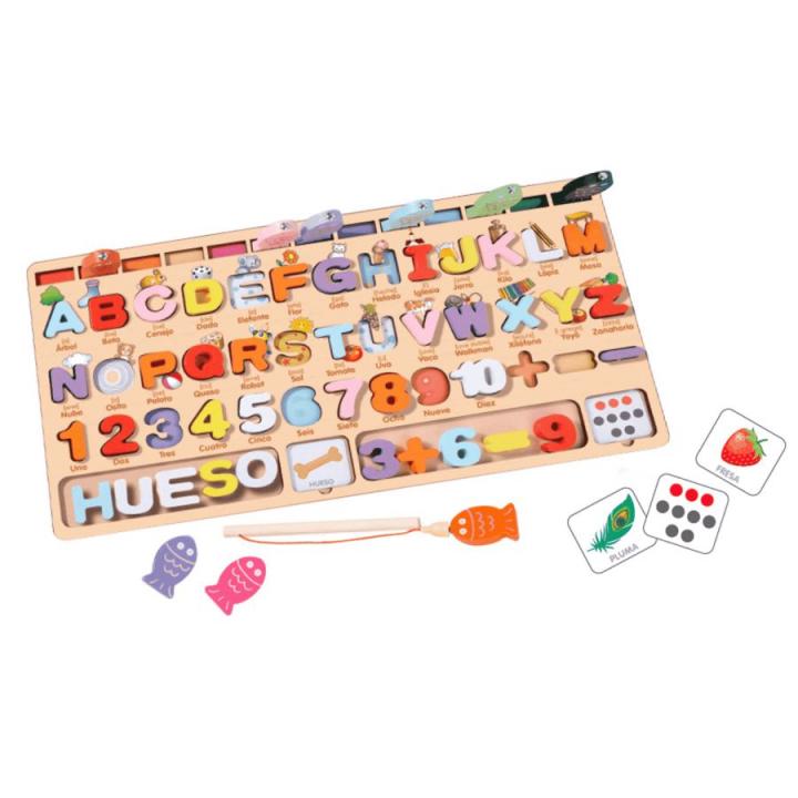 Aprendo abecedario y números Juego Educativo Infantil MaderaEste original juego de pescar educativo con piezas de madera es el regalo perfecto para los bebés de 3 a 5 años. Con este tablero de actividades, los pequeños podrán aprender mientras juegan y mejorar sus habilidades cognitivas, motoras y de observación. Aprenderán números, letras y figuras.Características:Juego educativo de madera Apto para niños de 3 a 5 años Aprende números, letras y figuras Desarrolla habilidades cognitivas, motoras y de observación Beneficios destacados: Este juego fomenta la concentración, la observación y el pensamiento lógico en los niños. Además, ayuda a desarrollar la motricidad fina, la coordinación ojo-mano y la destreza manual. Los pequeños podrán reconocer letras, números y formas mientras se divierten jugando.Cómo puede ayudar a su desarrollo infantil El juego de pescar educativo estimula diversas habilidades en los niños: Habilidades cognitivas: Fomenta la concentración, la observación y el pensamiento lógico. Habilidades motoras: Ayuda a desarrollar la motricidad fina, la coordinación ojo-mano y la destreza manual. Habilidades de observación: Permite a los niños reconocer letras, números y formas. ¡Adquiere hoy mismo este juego educativo de pescar y ayuda a tu pequeño a aprender y divertirse!